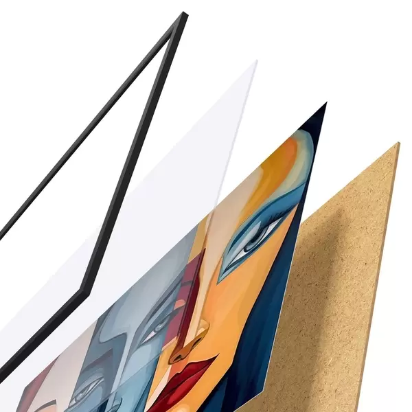 De poster bestaat uit een frame, plexiglas, geprinte afbeelding en spaanplaat achterkant. De poster kan meteen aan de muur worden gehangen dankzij de bevestigingen op de achterkant.