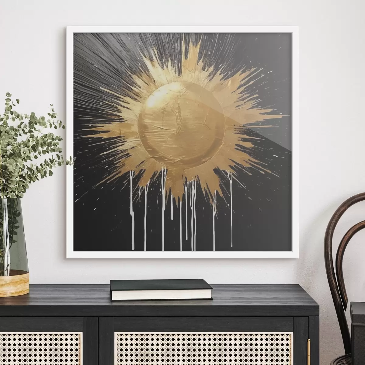 Je kunt het schilderij ophangen aan schroeven. Hiervoor leveren we bevestigingen bij onze foto's, zodat je de foto gemakkelijk kunt ophangen.