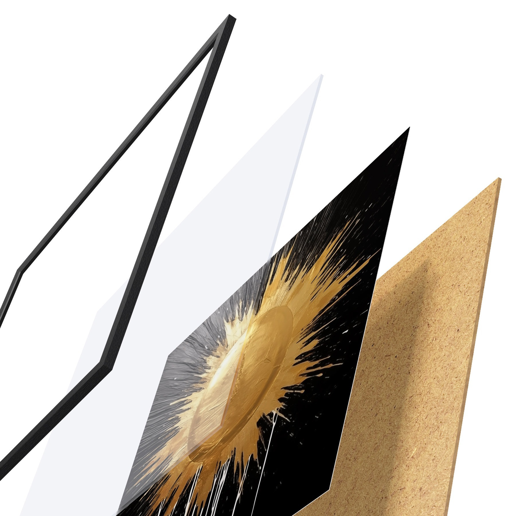 De poster bestaat uit een frame, plexiglas, geprinte afbeelding en spaanplaat achterkant. De poster kan meteen aan de muur worden gehangen dankzij de bevestigingen op de achterkant.