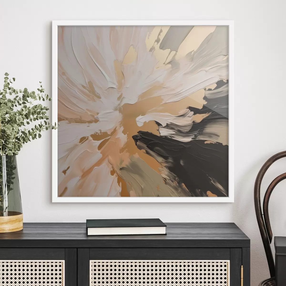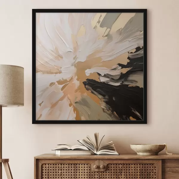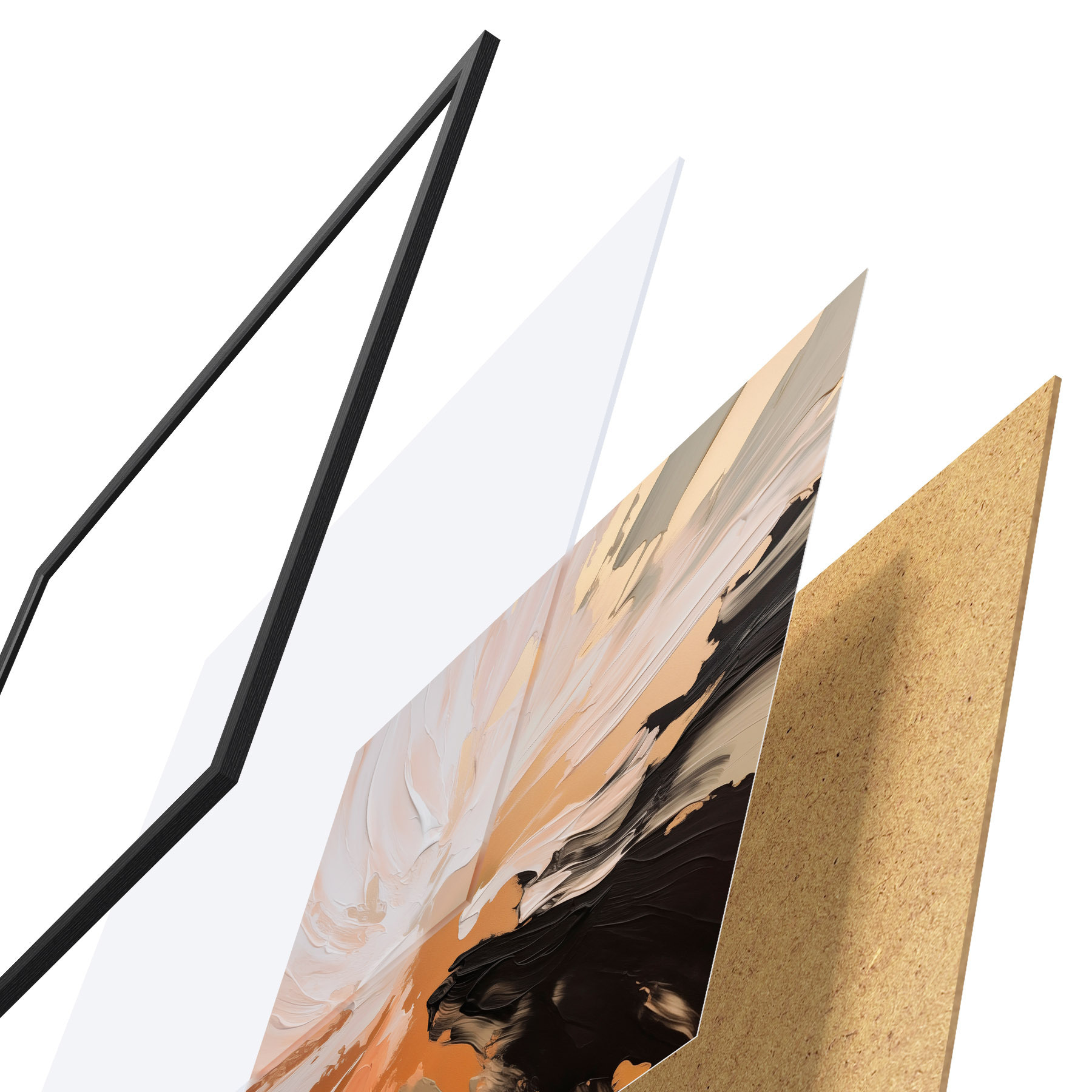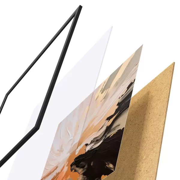 De poster bestaat uit een frame, plexiglas, geprinte afbeelding en spaanplaat achterkant. De poster kan meteen aan de muur worden gehangen dankzij de bevestigingen op de achterkant.