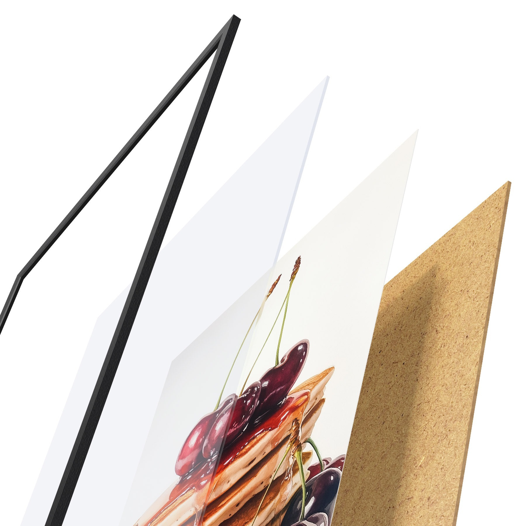 De poster bestaat uit een frame, plexiglas, geprinte afbeelding en spaanplaat achterkant. De poster kan meteen aan de muur worden gehangen dankzij de bevestigingen op de achterkant.