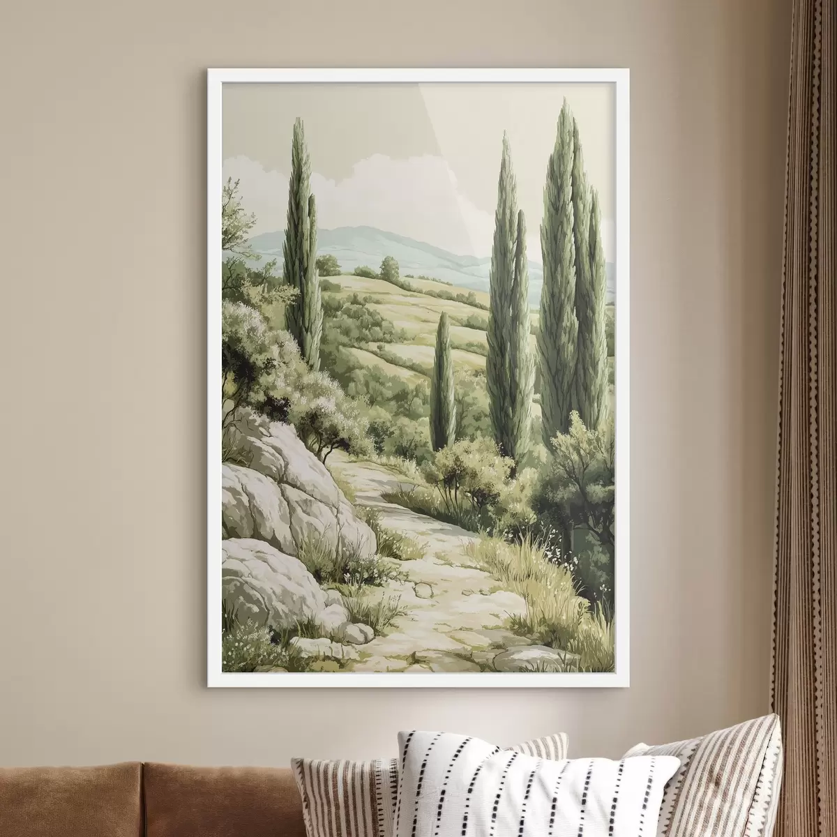 Poster Zomerlandschappen met cipressen en groene heuvels, rustieke stijl Nr f44308