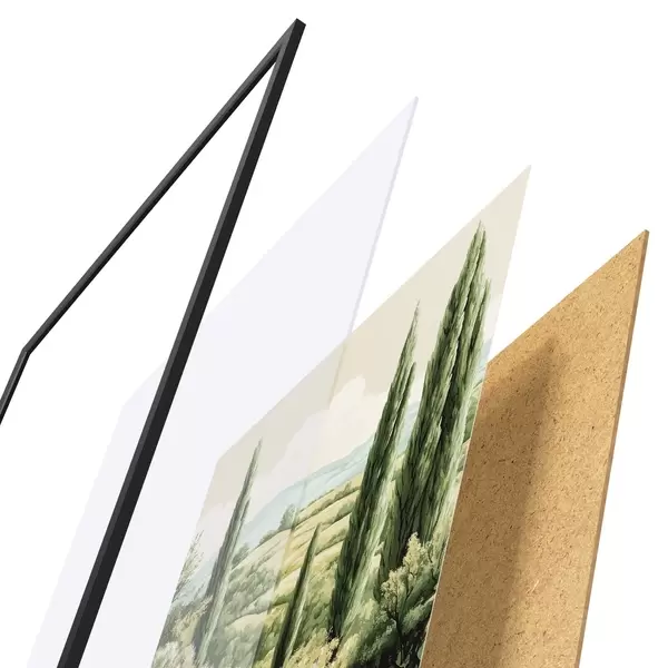 De poster bestaat uit een frame, plexiglas, geprinte afbeelding en spaanplaat achterkant. De poster kan meteen aan de muur worden gehangen dankzij de bevestigingen op de achterkant.