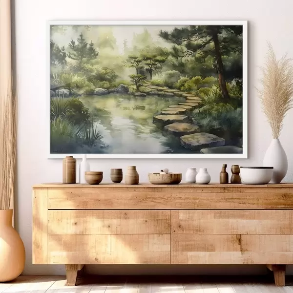 Poster Oosters bos met rotsen, vijver en pijnbomen, groen, aquarelstijl Nr f44311
