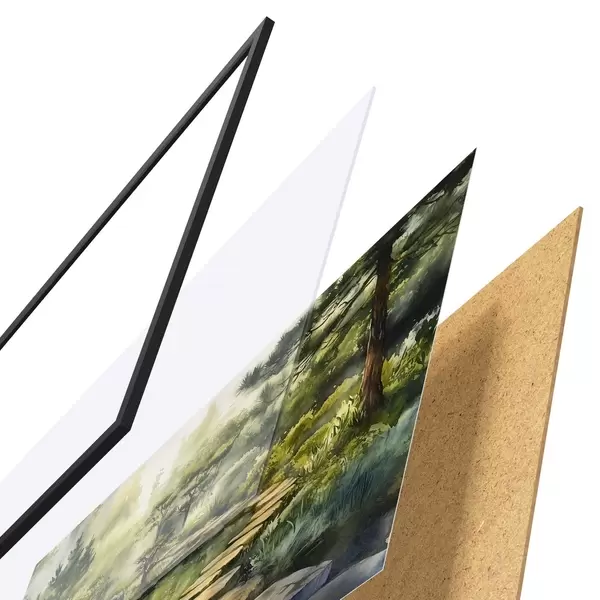 De poster bestaat uit een frame, plexiglas, geprinte afbeelding en spaanplaat achterkant. De poster kan meteen aan de muur worden gehangen dankzij de bevestigingen op de achterkant.