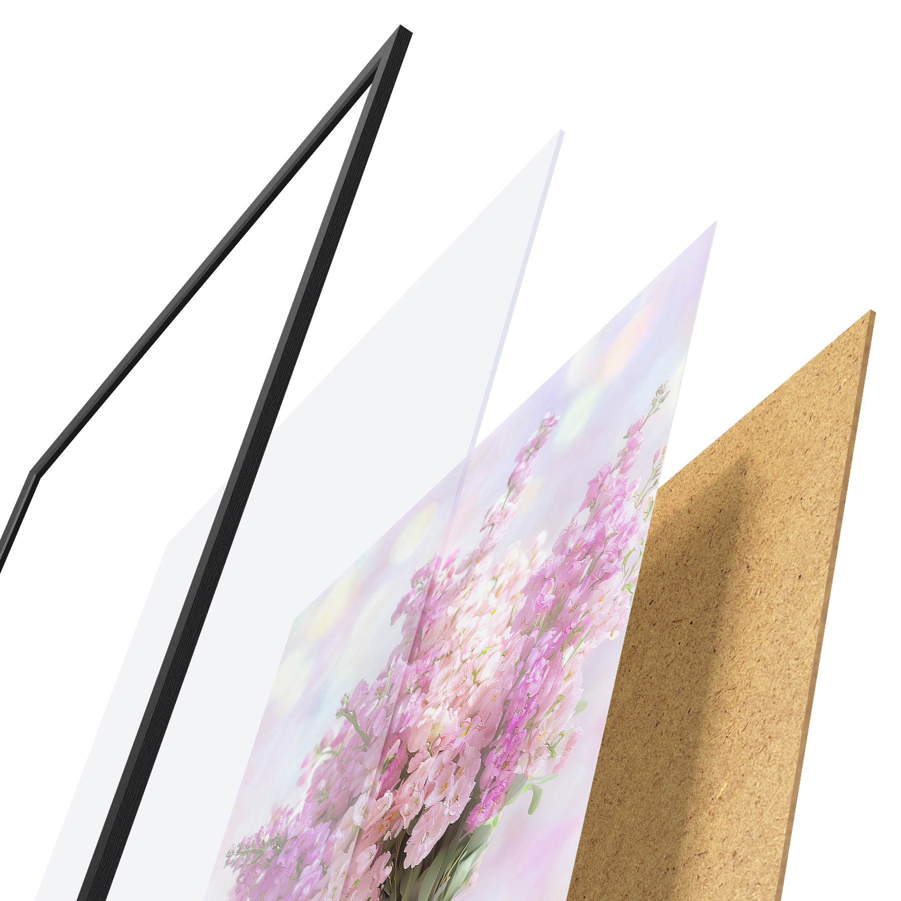 De poster bestaat uit een frame, plexiglas, geprinte afbeelding en spaanplaat achterkant. De poster kan meteen aan de muur worden gehangen dankzij de bevestigingen op de achterkant.