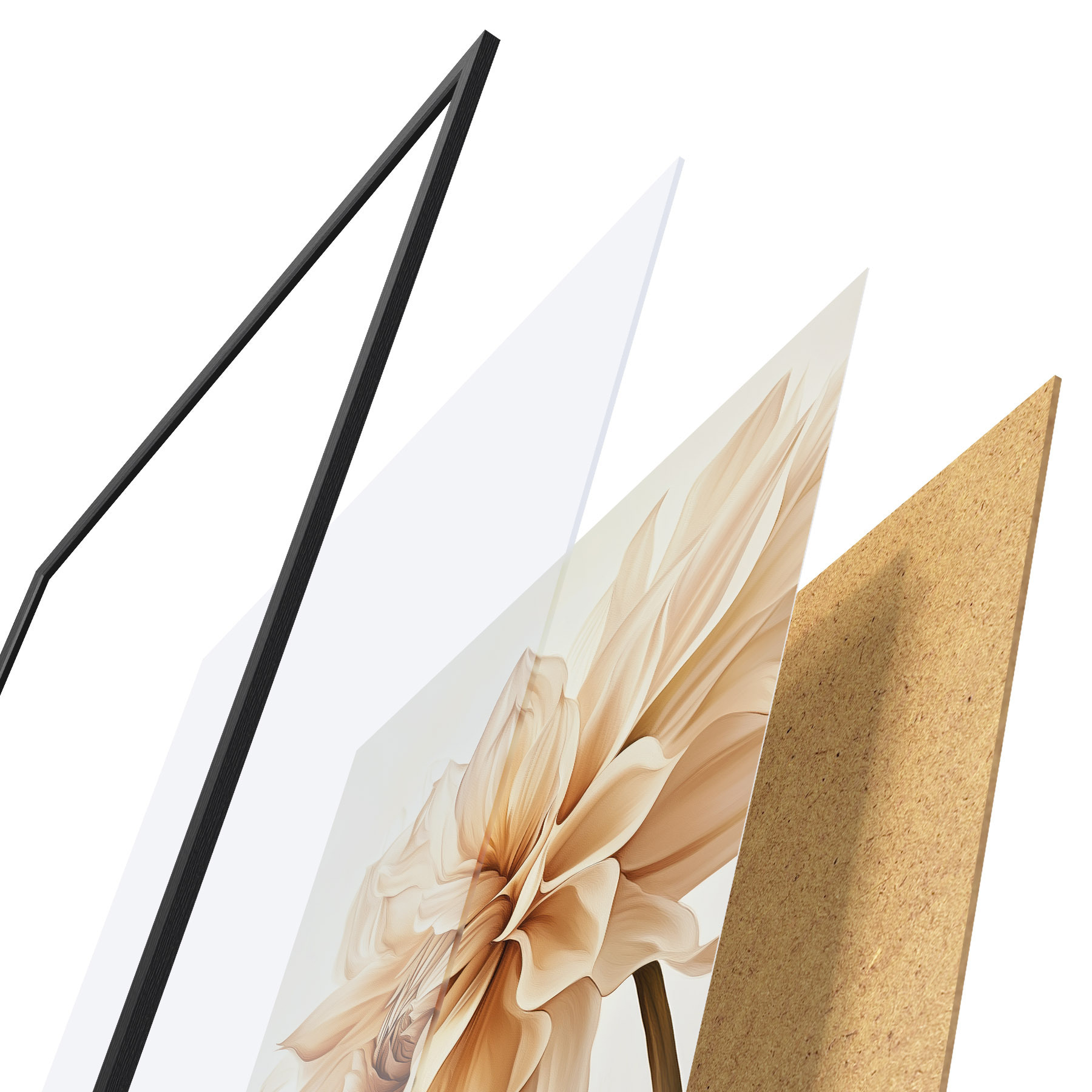 De poster bestaat uit een frame, plexiglas, geprinte afbeelding en spaanplaat achterkant. De poster kan meteen aan de muur worden gehangen dankzij de bevestigingen op de achterkant.