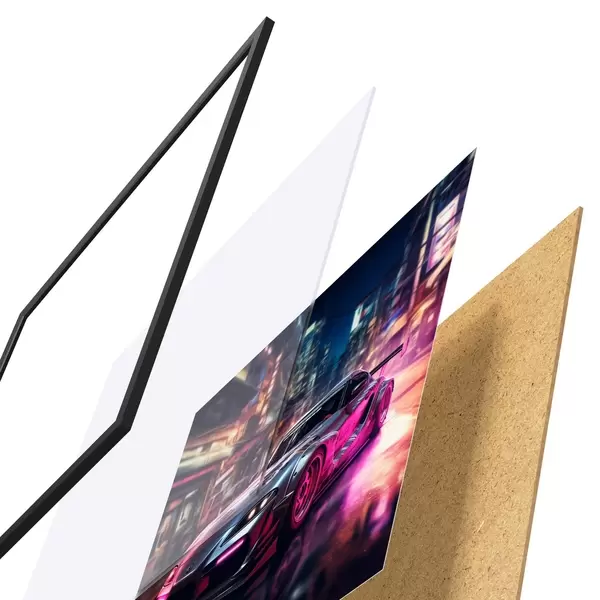 De poster bestaat uit een frame, plexiglas, geprinte afbeelding en spaanplaat achterkant. De poster kan meteen aan de muur worden gehangen dankzij de bevestigingen op de achterkant.