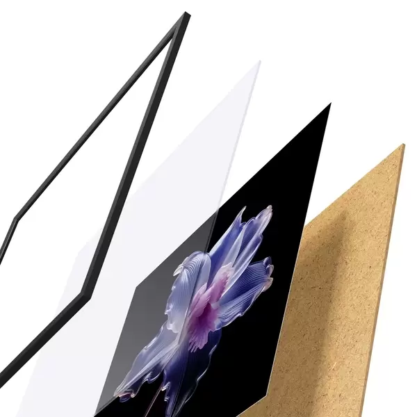 De poster bestaat uit een frame, plexiglas, geprinte afbeelding en spaanplaat achterkant. De poster kan meteen aan de muur worden gehangen dankzij de bevestigingen op de achterkant.