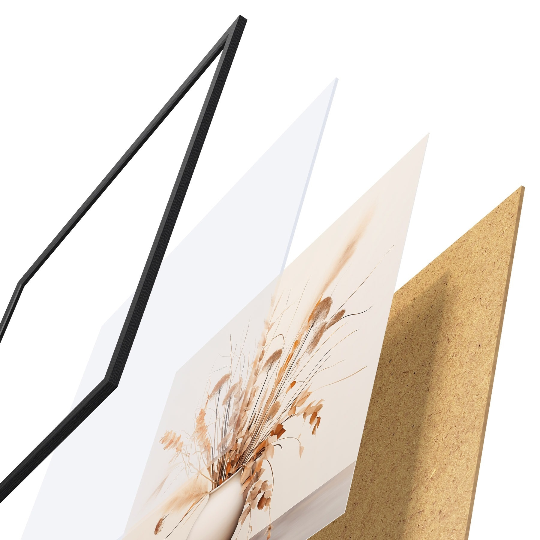 De poster bestaat uit een frame, plexiglas, geprinte afbeelding en spaanplaat achterkant. De poster kan meteen aan de muur worden gehangen dankzij de bevestigingen op de achterkant.