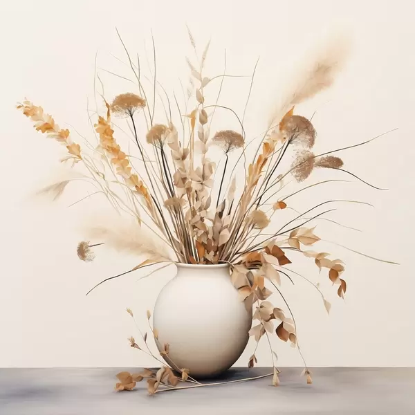 Poster Arrangement van gedroogde grassen en bloemen in een witte vaas Nr f44348