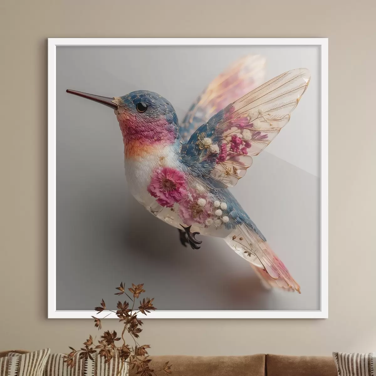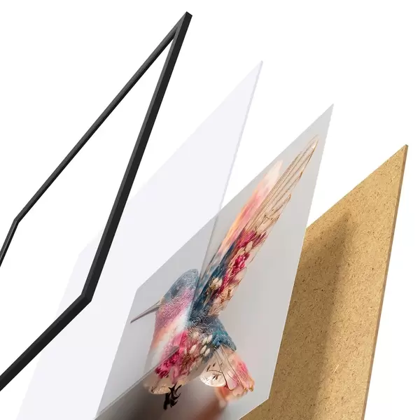 De poster bestaat uit een frame, plexiglas, geprinte afbeelding en spaanplaat achterkant. De poster kan meteen aan de muur worden gehangen dankzij de bevestigingen op de achterkant.