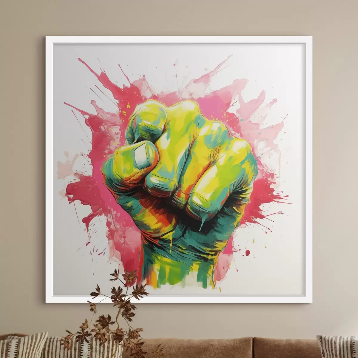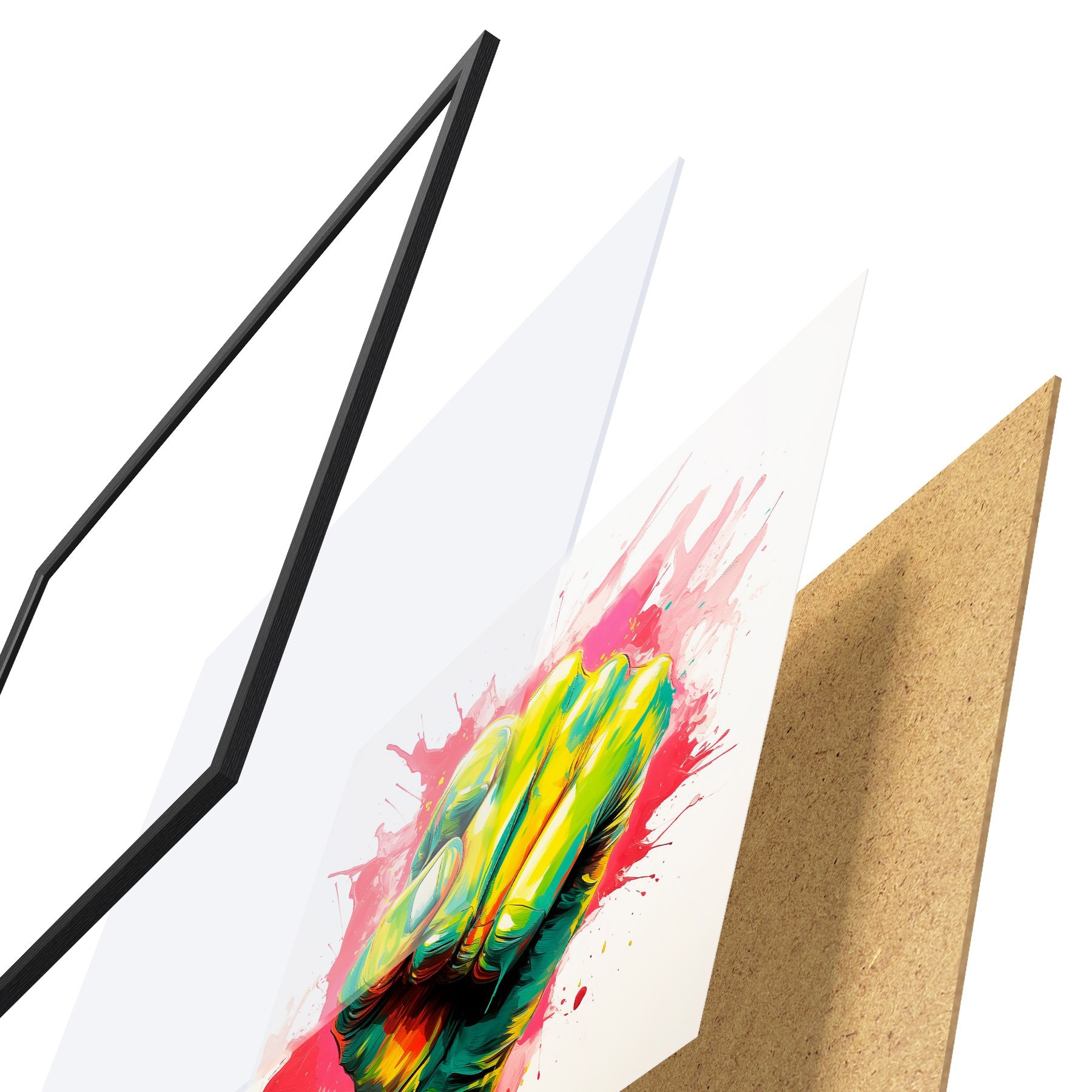 De poster bestaat uit een frame, plexiglas, geprinte afbeelding en spaanplaat achterkant. De poster kan meteen aan de muur worden gehangen dankzij de bevestigingen op de achterkant.