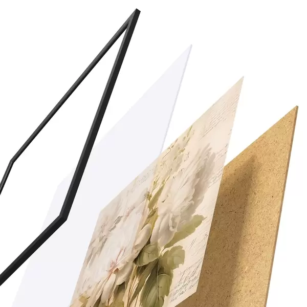 De poster bestaat uit een frame, plexiglas, geprinte afbeelding en spaanplaat achterkant. De poster kan meteen aan de muur worden gehangen dankzij de bevestigingen op de achterkant.