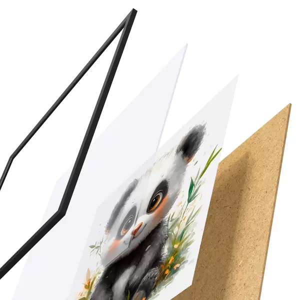 De poster bestaat uit een frame, plexiglas, geprinte afbeelding en spaanplaat achterkant. De poster kan meteen aan de muur worden gehangen dankzij de bevestigingen op de achterkant.
