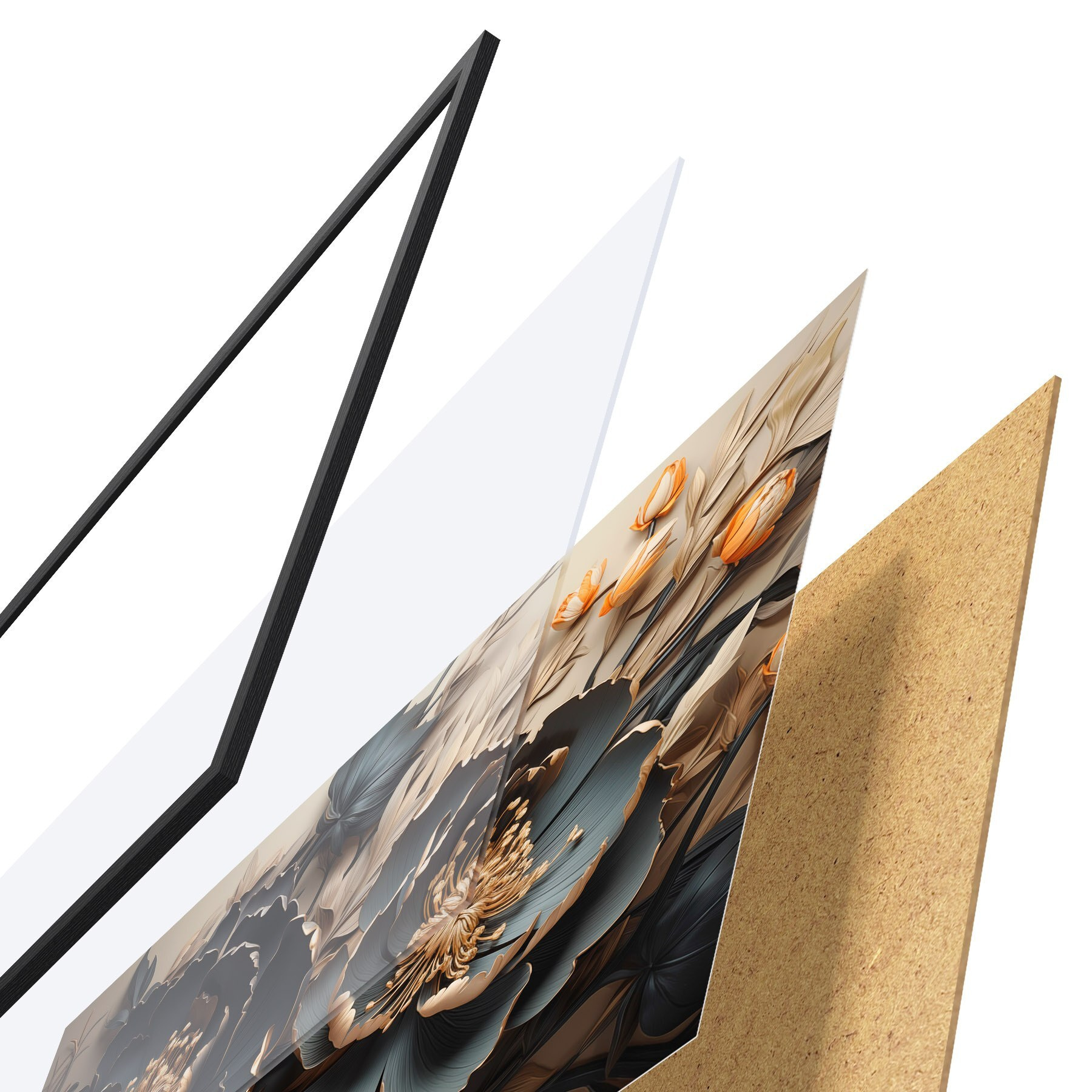De poster bestaat uit een frame, plexiglas, geprinte afbeelding en spaanplaat achterkant. De poster kan meteen aan de muur worden gehangen dankzij de bevestigingen op de achterkant.