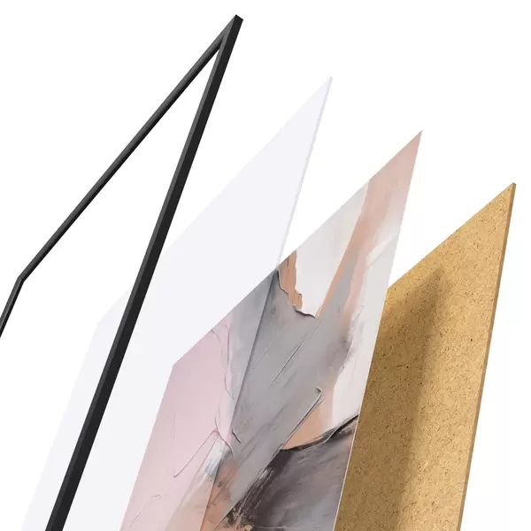 De poster bestaat uit een frame, plexiglas, geprinte afbeelding en spaanplaat achterkant. De poster kan meteen aan de muur worden gehangen dankzij de bevestigingen op de achterkant.