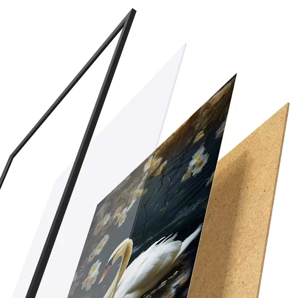 De poster bestaat uit een frame, plexiglas, geprinte afbeelding en spaanplaat achterkant. De poster kan meteen aan de muur worden gehangen dankzij de bevestigingen op de achterkant.