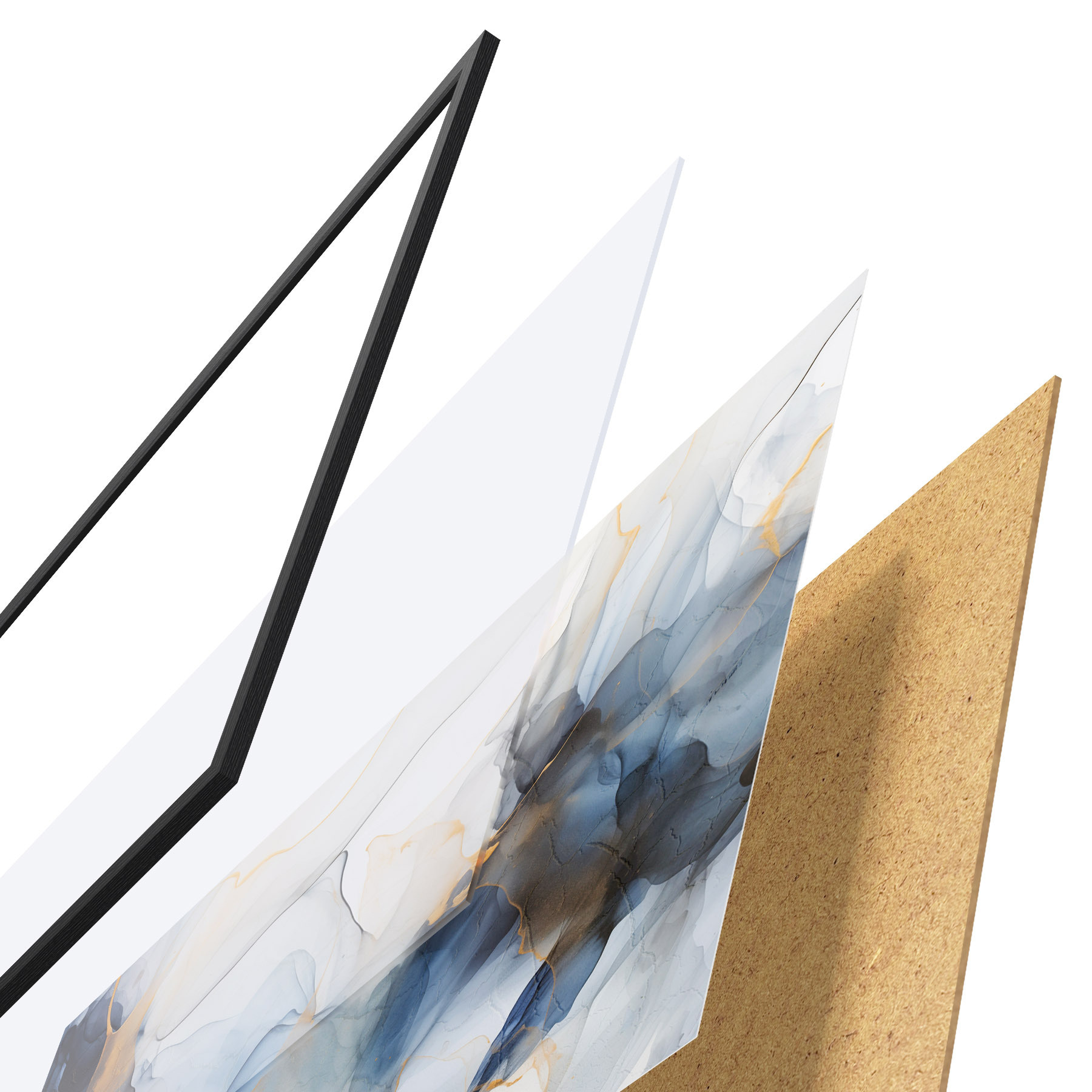 De poster bestaat uit een frame, plexiglas, geprinte afbeelding en spaanplaat achterkant. De poster kan meteen aan de muur worden gehangen dankzij de bevestigingen op de achterkant.