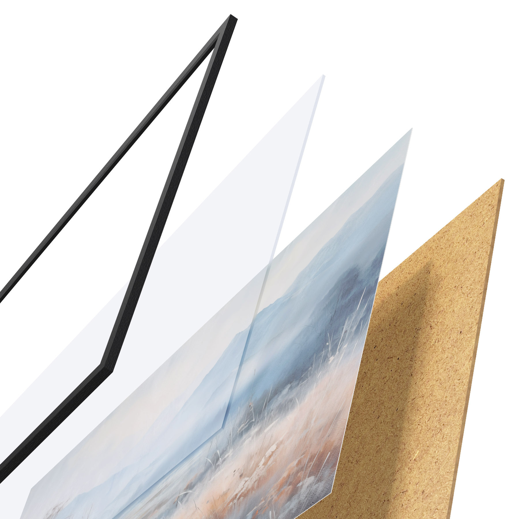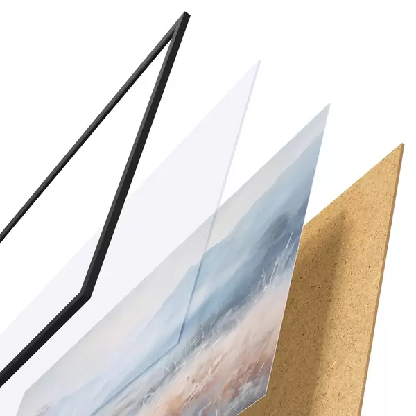 De poster bestaat uit een frame, plexiglas, geprinte afbeelding en spaanplaat achterkant. De poster kan meteen aan de muur worden gehangen dankzij de bevestigingen op de achterkant.