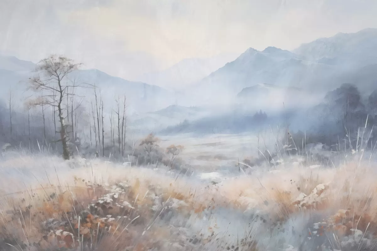 Poster Structuurlandschap met bergen, droog gras en een bos, gedempte kleuren Nr f44402