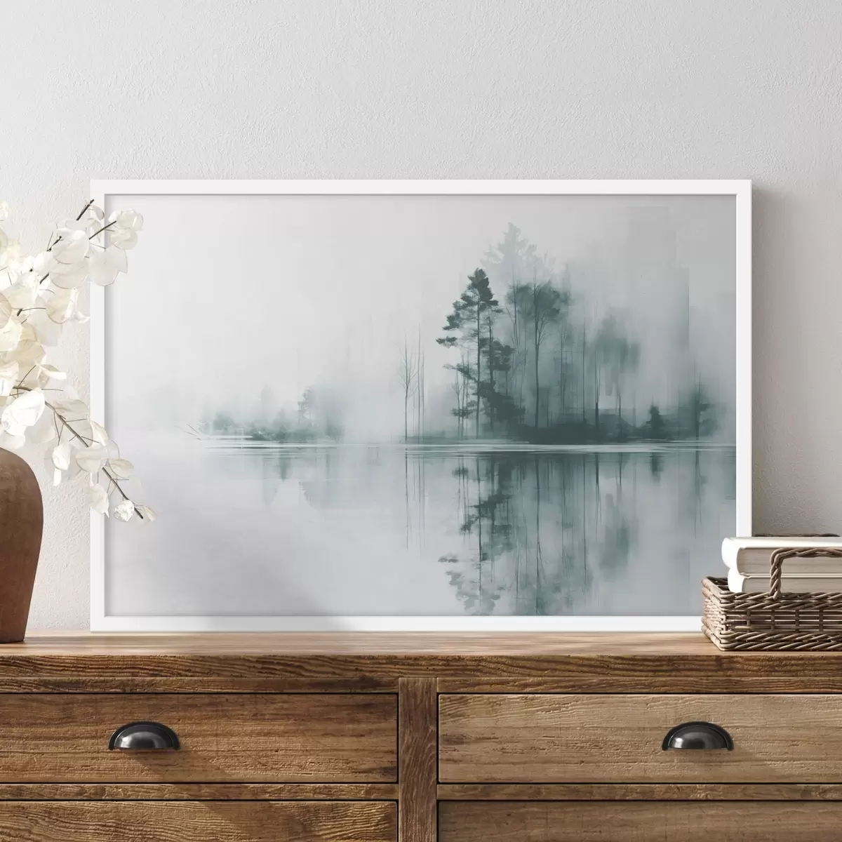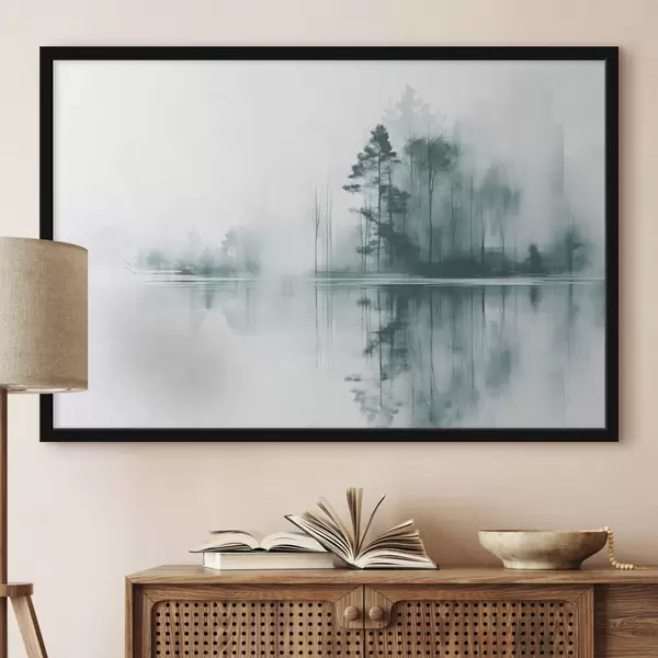 Poster Abstract bos met hoge bomen weerspiegeld in het water, gedempt kleurenpalet Nr f44403