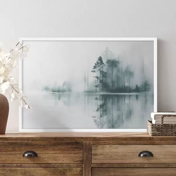 Poster Abstract bos met hoge bomen weerspiegeld in het water, gedempt kleurenpalet f44403
