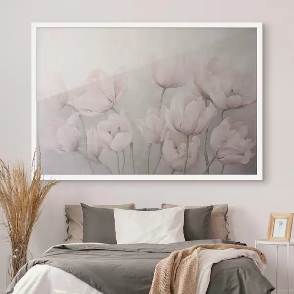 Poster Vintage roze tulpen met lange stelen, zachte gedempte kleuren, lichtgrijze achtergrond Nr f44407