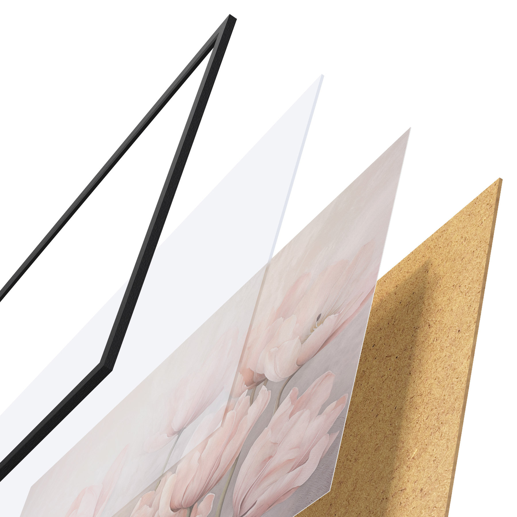 De poster bestaat uit een frame, plexiglas, geprinte afbeelding en spaanplaat achterkant. De poster kan meteen aan de muur worden gehangen dankzij de bevestigingen op de achterkant.