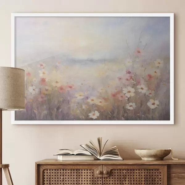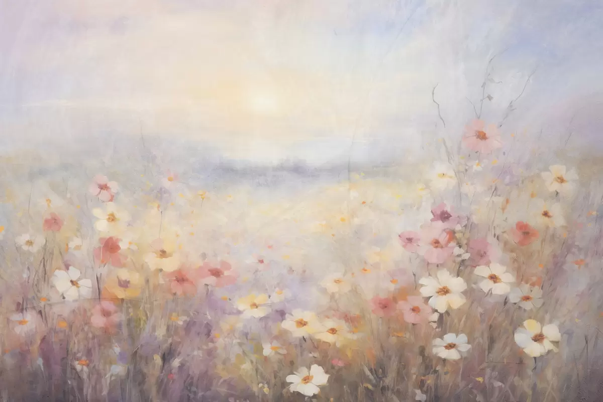 Poster Gestructureerd zonnig landschap van bloemenveld, zachte pastelkleuren, dromerige sfeer Nr f44408