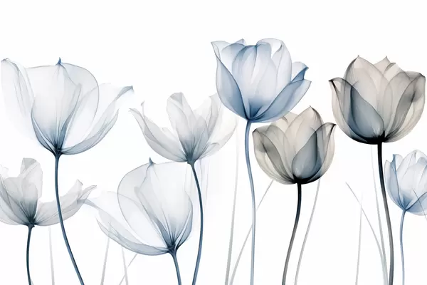 Poster Doorschijnende blauwe en witte tulpen met lange stelen, tegen een effen witte achtergrond Nr f44409