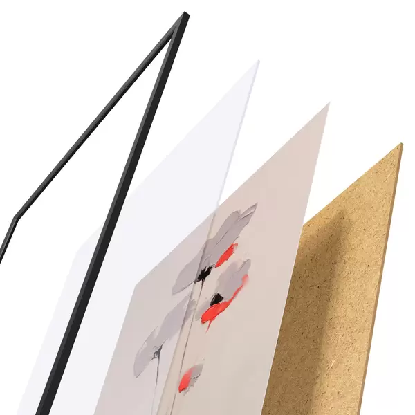 De poster bestaat uit een frame, plexiglas, geprinte afbeelding en spaanplaat achterkant. De poster kan meteen aan de muur worden gehangen dankzij de bevestigingen op de achterkant.