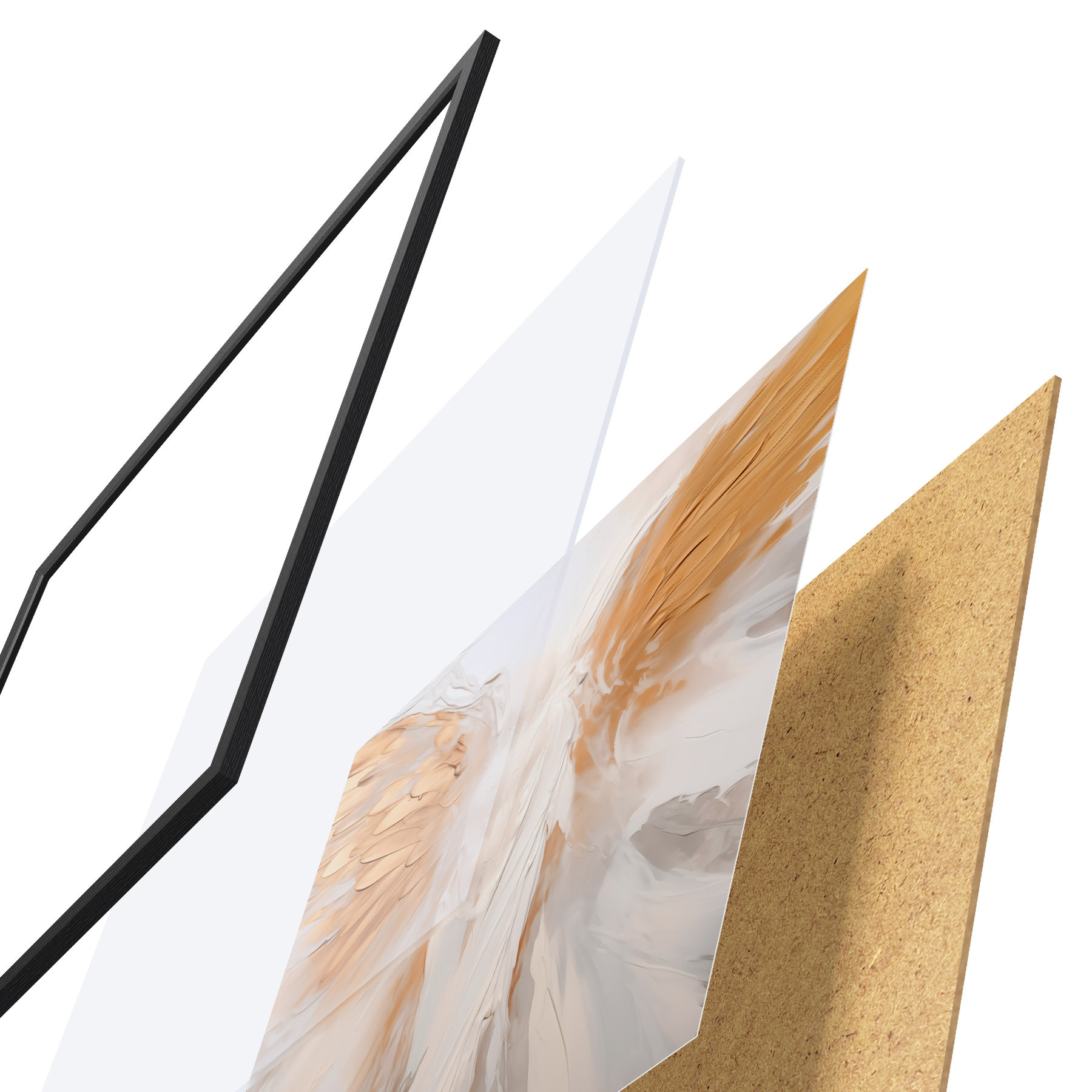 De poster bestaat uit een frame, plexiglas, geprinte afbeelding en spaanplaat achterkant. De poster kan meteen aan de muur worden gehangen dankzij de bevestigingen op de achterkant.