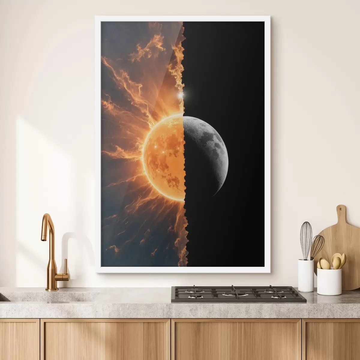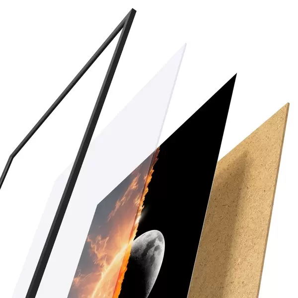 De poster bestaat uit een frame, plexiglas, geprinte afbeelding en spaanplaat achterkant. De poster kan meteen aan de muur worden gehangen dankzij de bevestigingen op de achterkant.