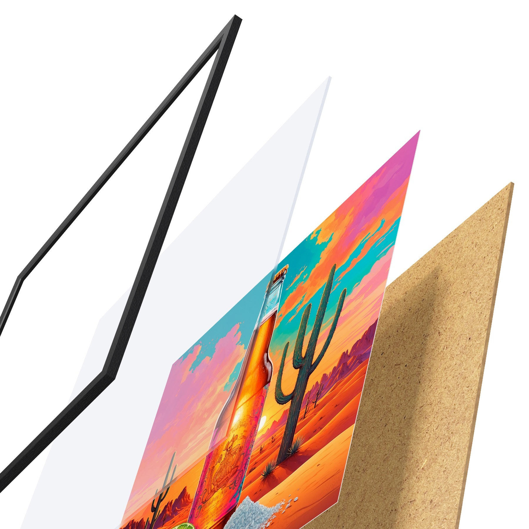 De poster bestaat uit een frame, plexiglas, geprinte afbeelding en spaanplaat achterkant. De poster kan meteen aan de muur worden gehangen dankzij de bevestigingen op de achterkant.
