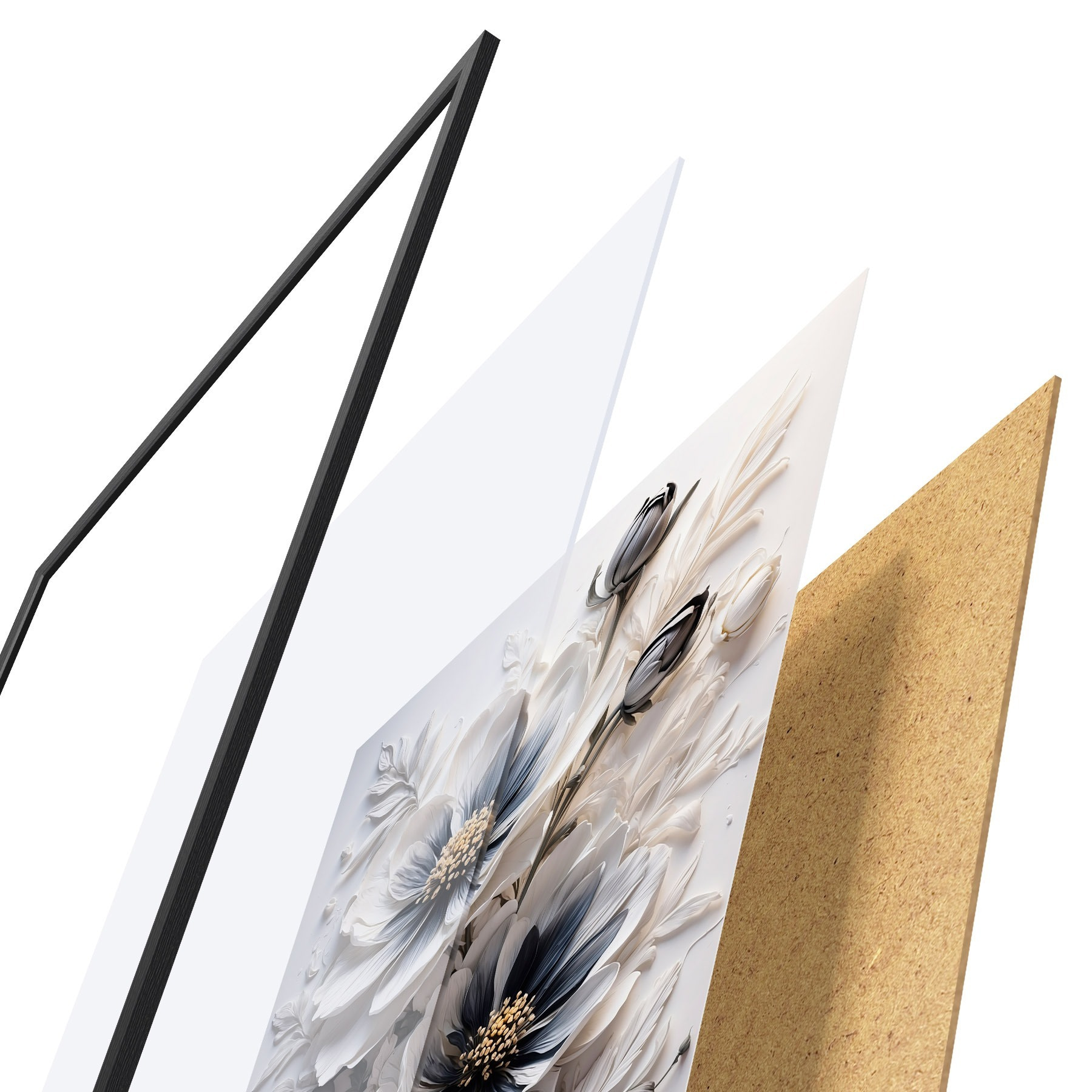 De poster bestaat uit een frame, plexiglas, geprinte afbeelding en spaanplaat achterkant. De poster kan meteen aan de muur worden gehangen dankzij de bevestigingen op de achterkant.