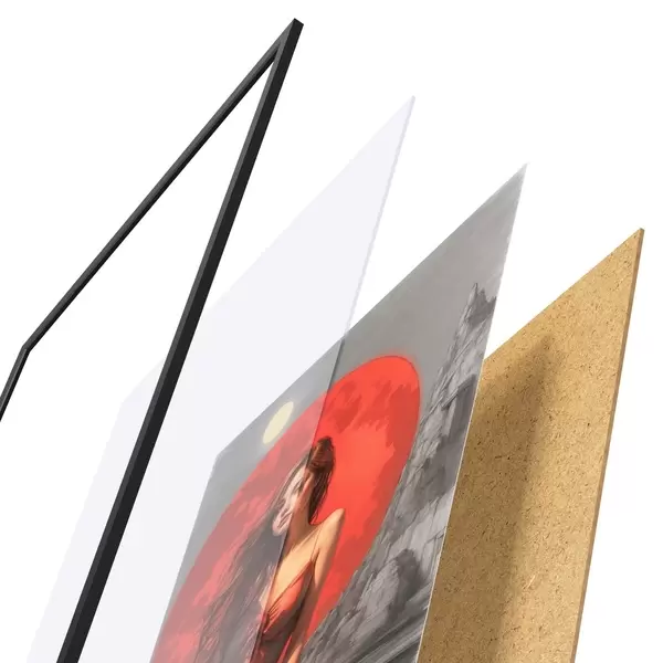 De poster bestaat uit een frame, plexiglas, geprinte afbeelding en spaanplaat achterkant. De poster kan meteen aan de muur worden gehangen dankzij de bevestigingen op de achterkant.