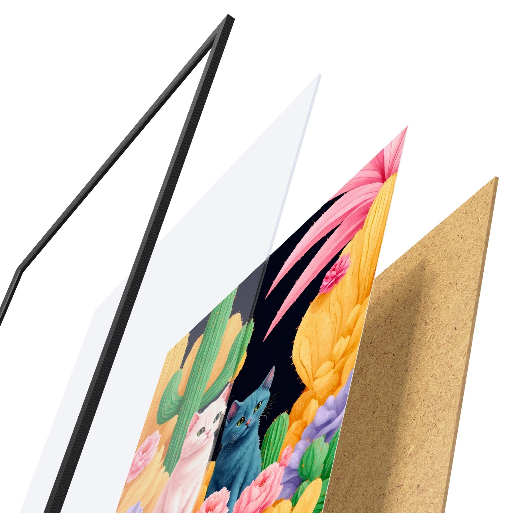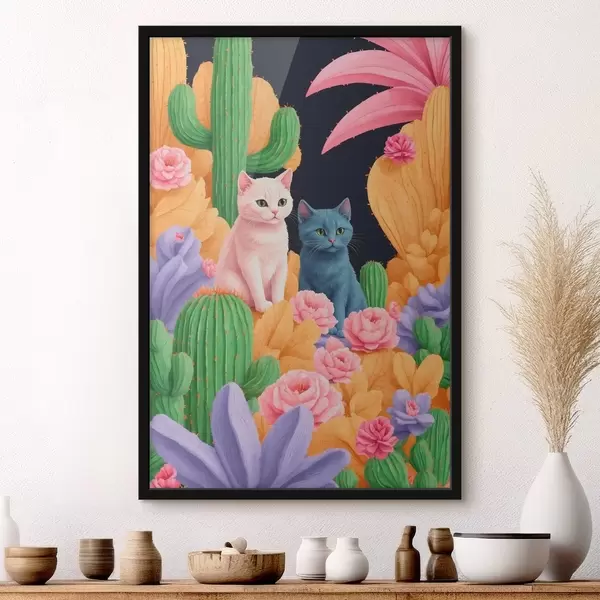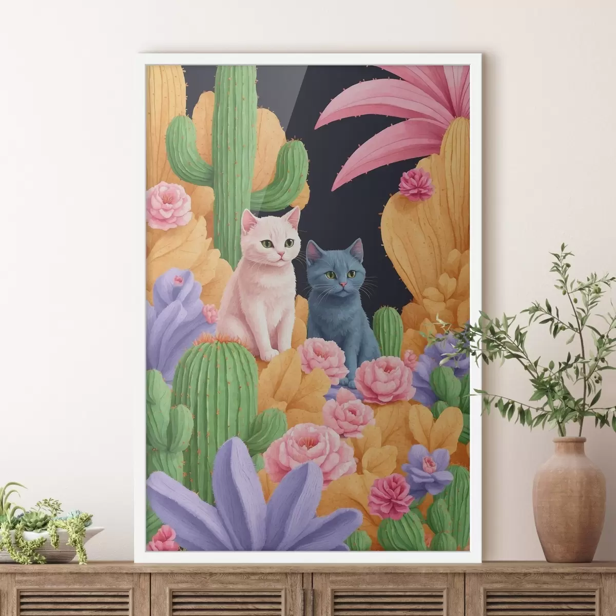 Poster Kunstmatige katten tussen bloemen en cactussen Nr f44452