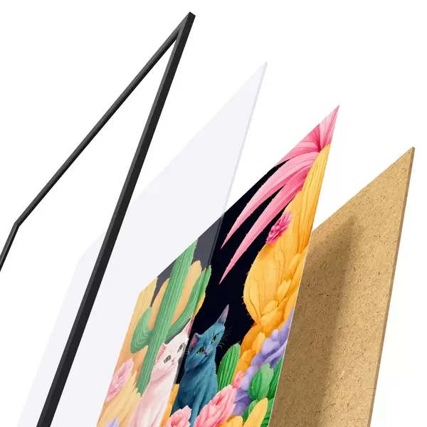 De poster bestaat uit een frame, plexiglas, geprinte afbeelding en spaanplaat achterkant. De poster kan meteen aan de muur worden gehangen dankzij de bevestigingen op de achterkant.