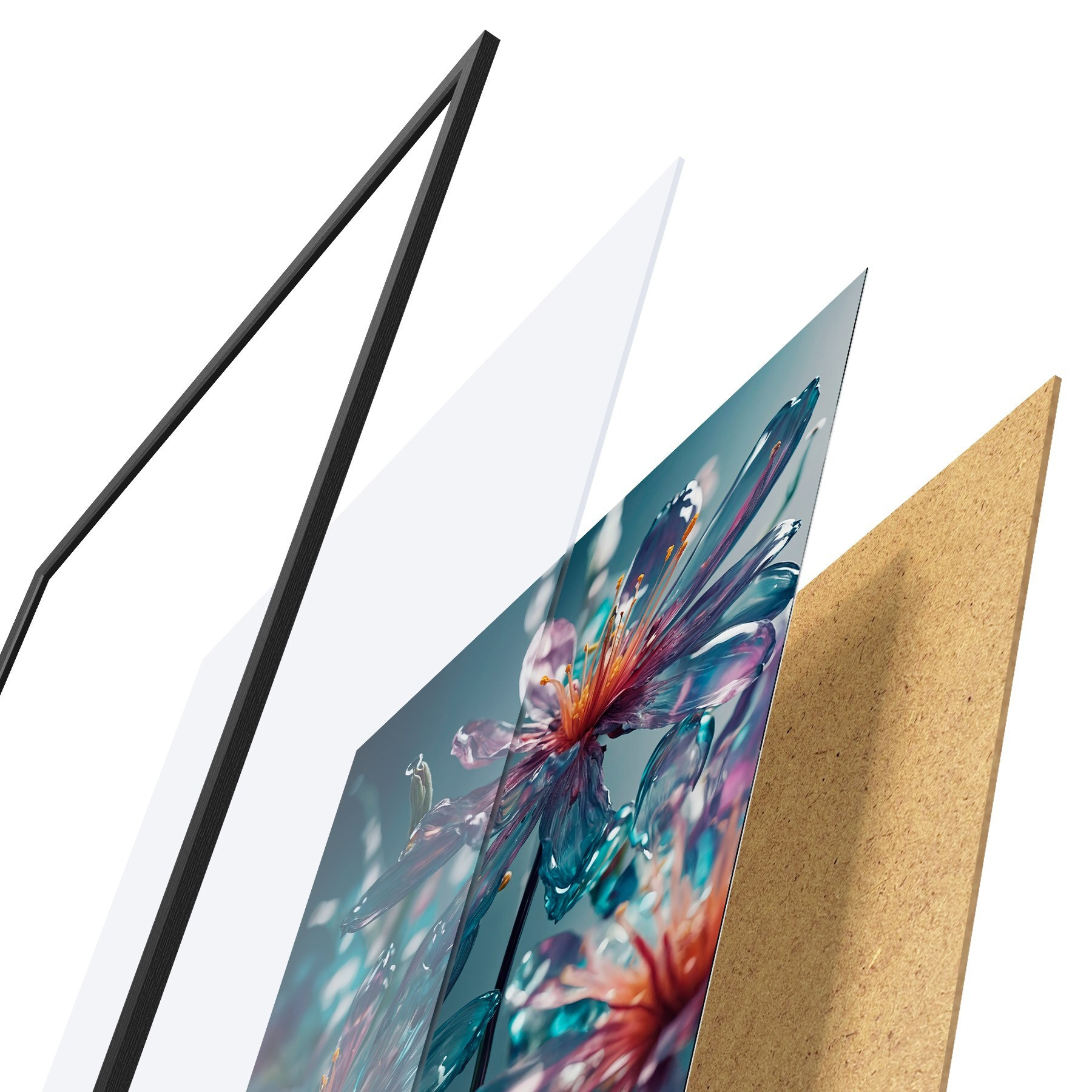 De poster bestaat uit een frame, plexiglas, geprinte afbeelding en spaanplaat achterkant. De poster kan meteen aan de muur worden gehangen dankzij de bevestigingen op de achterkant.