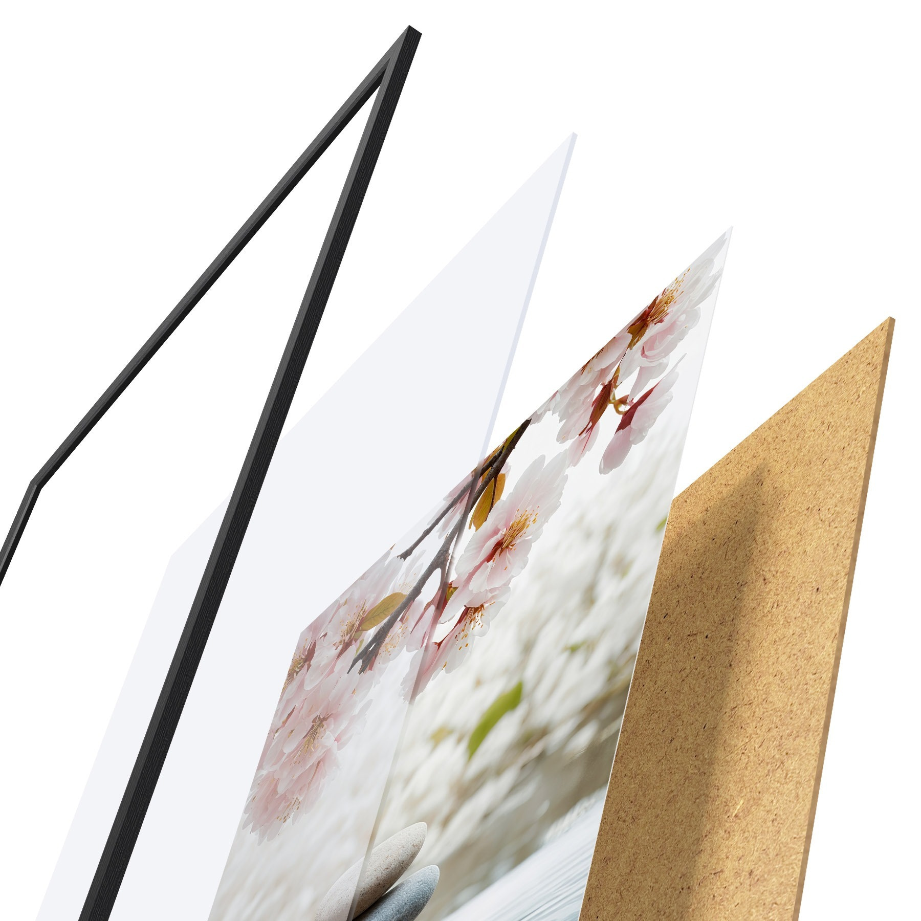De poster bestaat uit een frame, plexiglas, geprinte afbeelding en spaanplaat achterkant. De poster kan meteen aan de muur worden gehangen dankzij de bevestigingen op de achterkant.