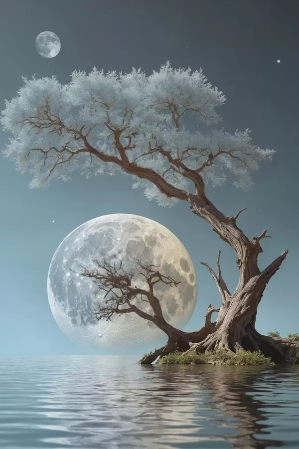 Poster Boom in het midden van een meer op maanachtergrond Nr f44481
