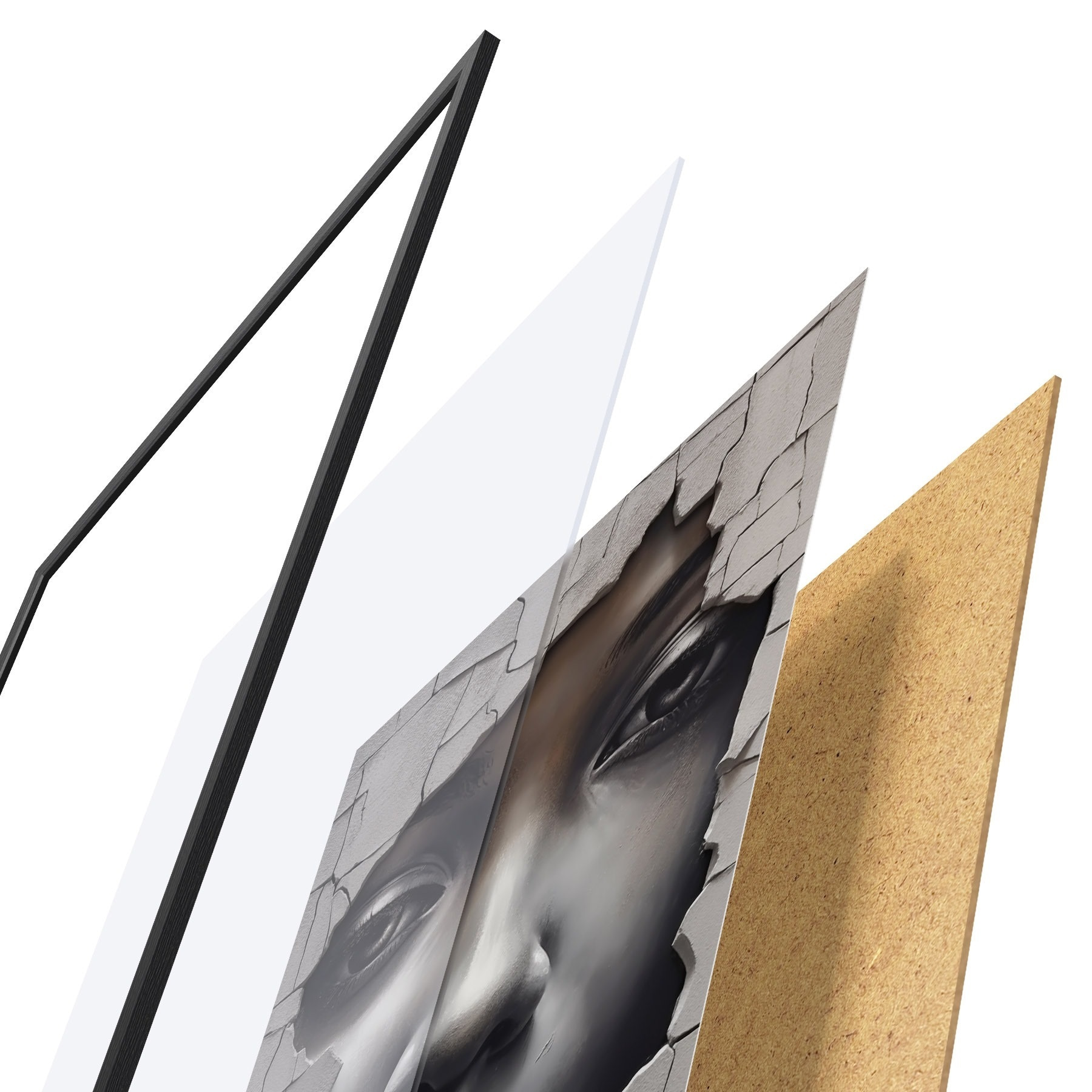De poster bestaat uit een frame, plexiglas, geprinte afbeelding en spaanplaat achterkant. De poster kan meteen aan de muur worden gehangen dankzij de bevestigingen op de achterkant.