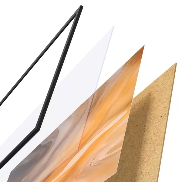 De poster bestaat uit een frame, plexiglas, geprinte afbeelding en spaanplaat achterkant. De poster kan meteen aan de muur worden gehangen dankzij de bevestigingen op de achterkant.