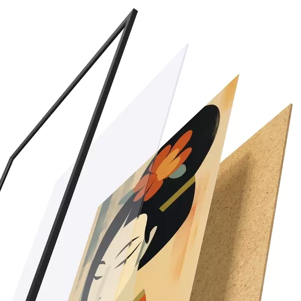 De poster bestaat uit een frame, plexiglas, geprinte afbeelding en spaanplaat achterkant. De poster kan meteen aan de muur worden gehangen dankzij de bevestigingen op de achterkant.