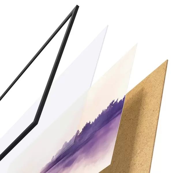 De poster bestaat uit een frame, plexiglas, geprinte afbeelding en spaanplaat achterkant. De poster kan meteen aan de muur worden gehangen dankzij de bevestigingen op de achterkant.