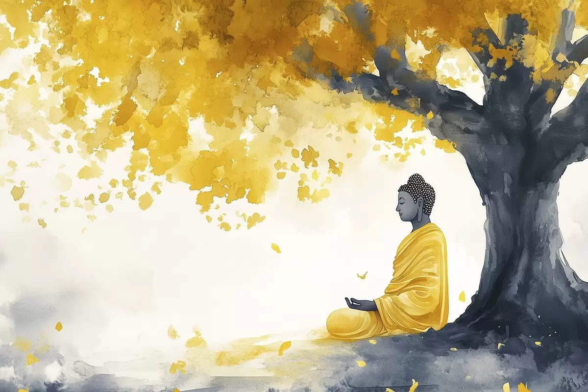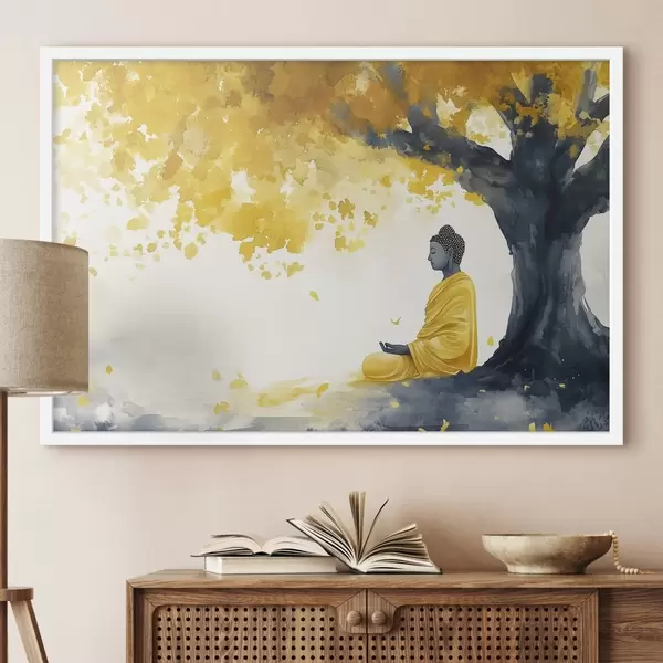 Poster Mediterende Boeddha onder de boom, gele en grijze kleuren Nr f44509