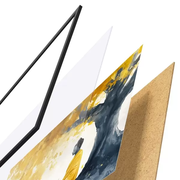 De poster bestaat uit een frame, plexiglas, geprinte afbeelding en spaanplaat achterkant. De poster kan meteen aan de muur worden gehangen dankzij de bevestigingen op de achterkant.