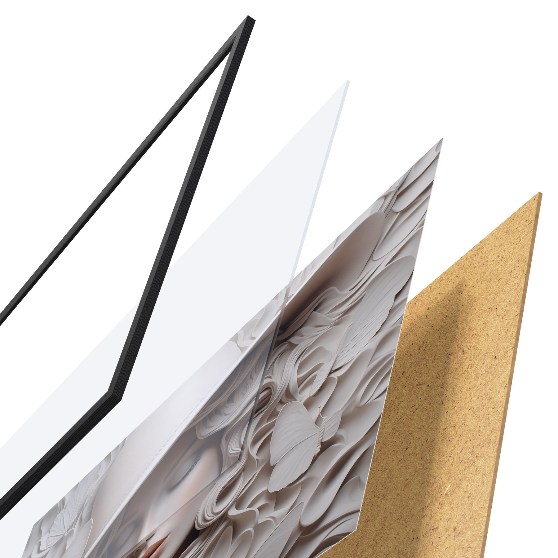 De poster bestaat uit een frame, plexiglas, geprinte afbeelding en spaanplaat achterkant. De poster kan meteen aan de muur worden gehangen dankzij de bevestigingen op de achterkant.