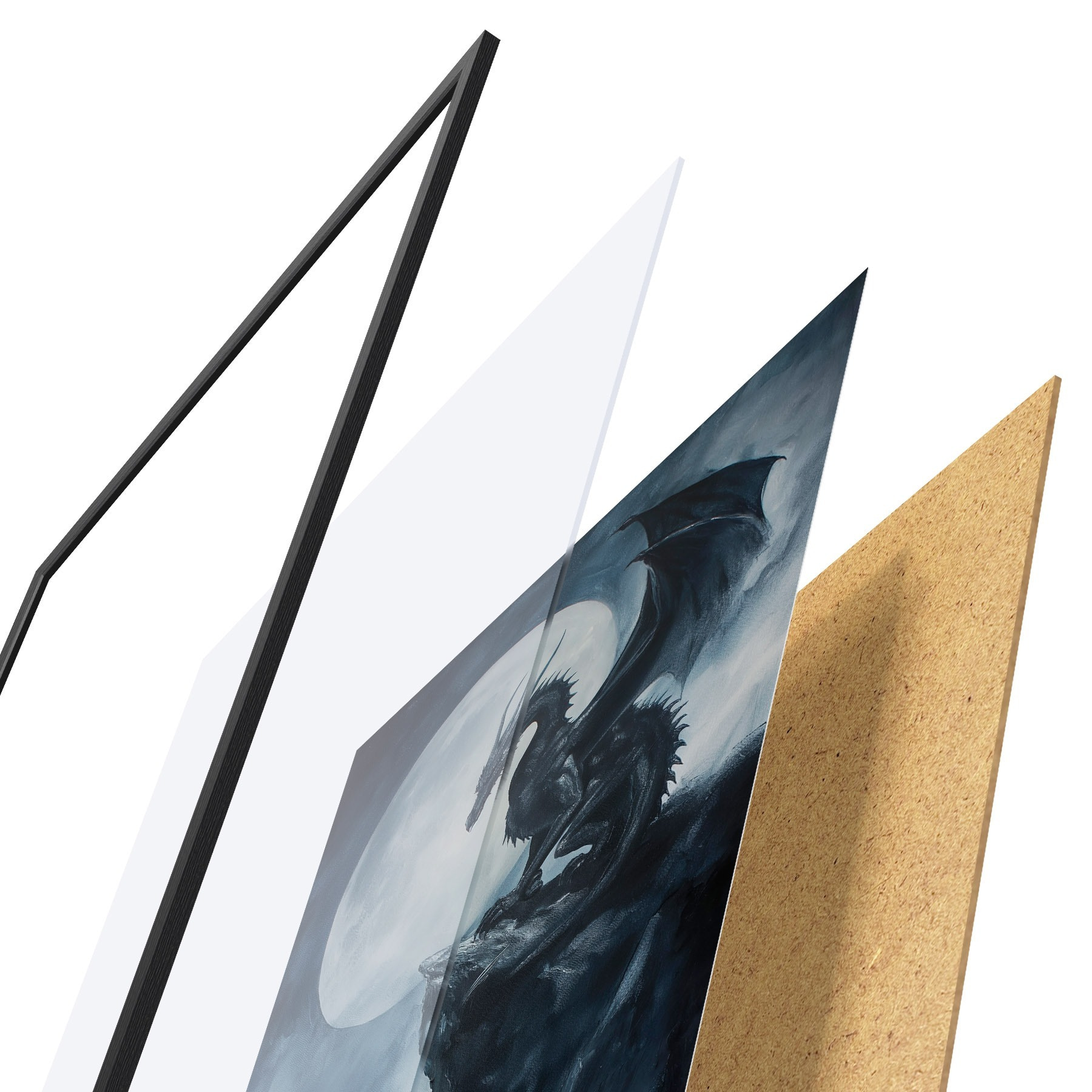 De poster bestaat uit een frame, plexiglas, geprinte afbeelding en spaanplaat achterkant. De poster kan meteen aan de muur worden gehangen dankzij de bevestigingen op de achterkant.